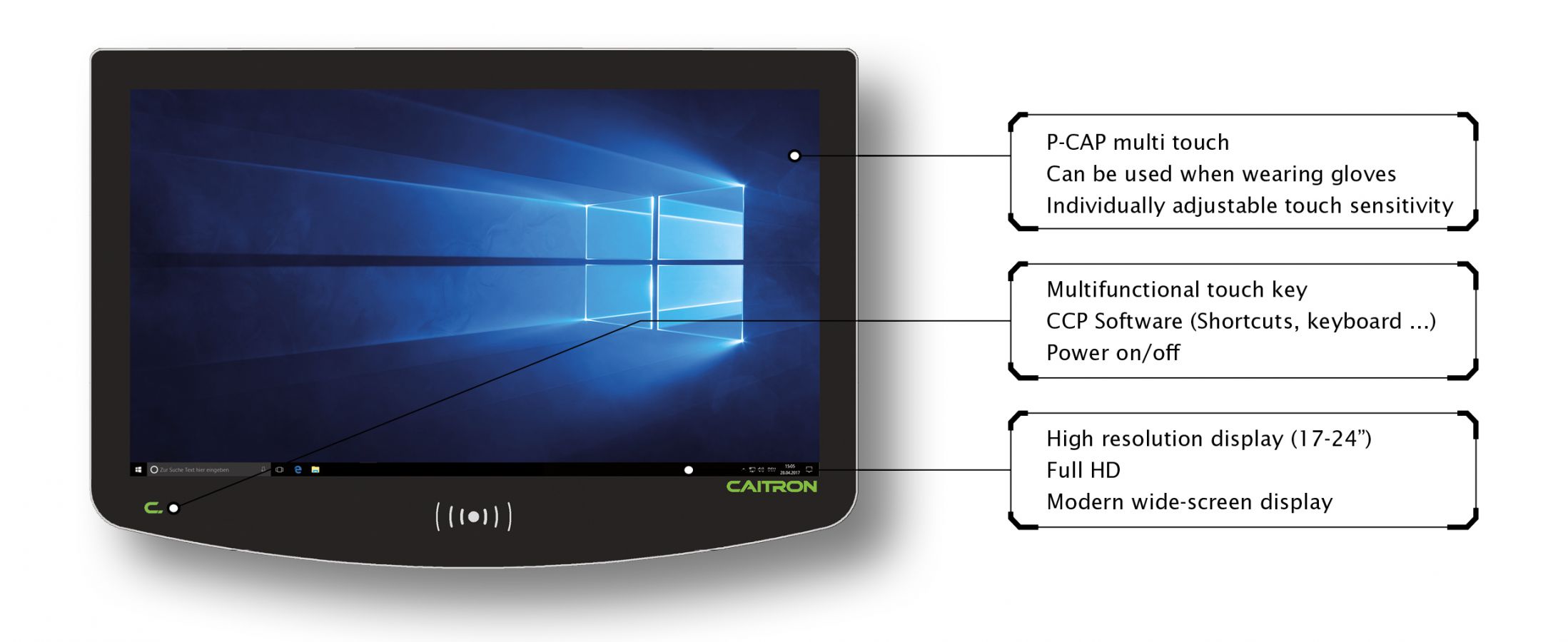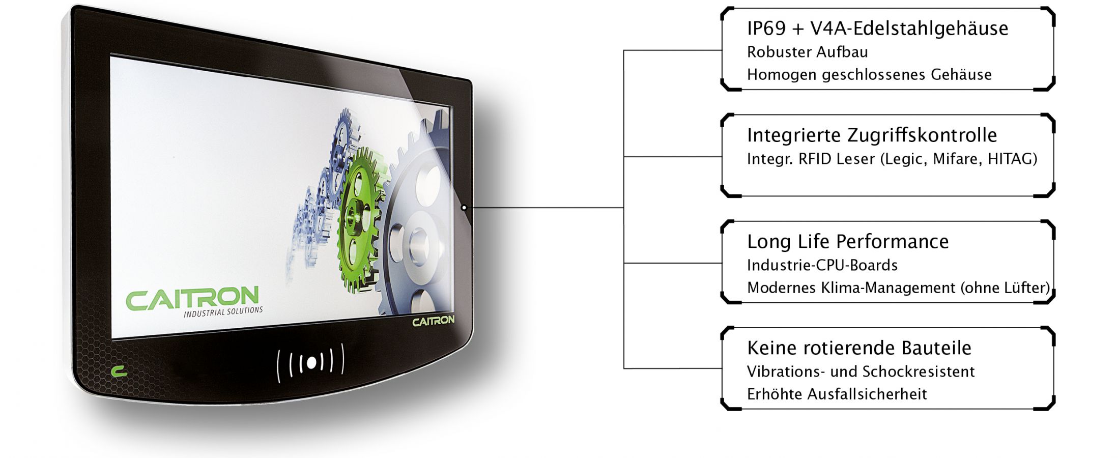 The industrial PCs from CAITRON can be equipped with integrated reader modules (Legic, Mifare, HiTAG). This enables seamless integration with cross-device integrated rights management and access control solutions. Employees contact the HMI contactlessly using RFID transponders. Thus, access permissions can be coupled with existing authentication solutions (e.g., access control, time tracking).