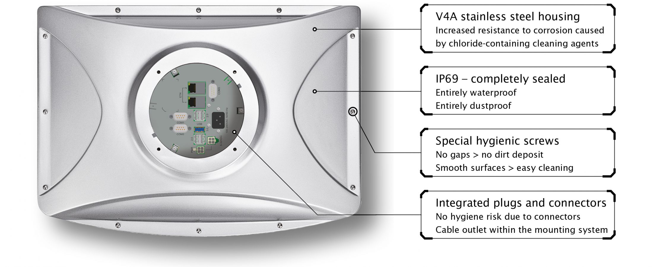 In addition, the V4A stainless steel housings of our industrial PC solutions are completely closed (IP69) and feature a secure and gap-free seal. This is done via an external seal which is far more resistant to conventional aggressive cleaning agents, acids and alkalis than conventional seals.