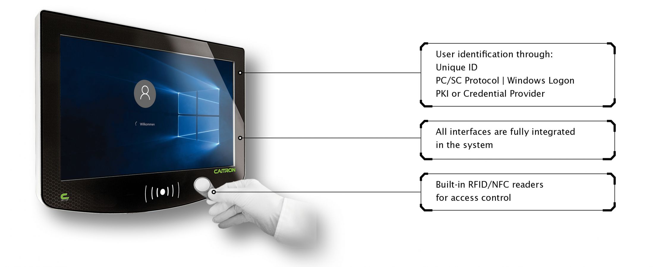 The industrial and cleanroom PCs from CAITRON can be equipped with integrated reader modules (Legic, Mifare, HiTAG). This enables seamless integration with cross-device integrated rights management and access control solutions. Employees contact the HMI contactlessly using RFID transponders. Thus, access permissions can be coupled with existing authentication solutions (e.g., access control, time tracking).