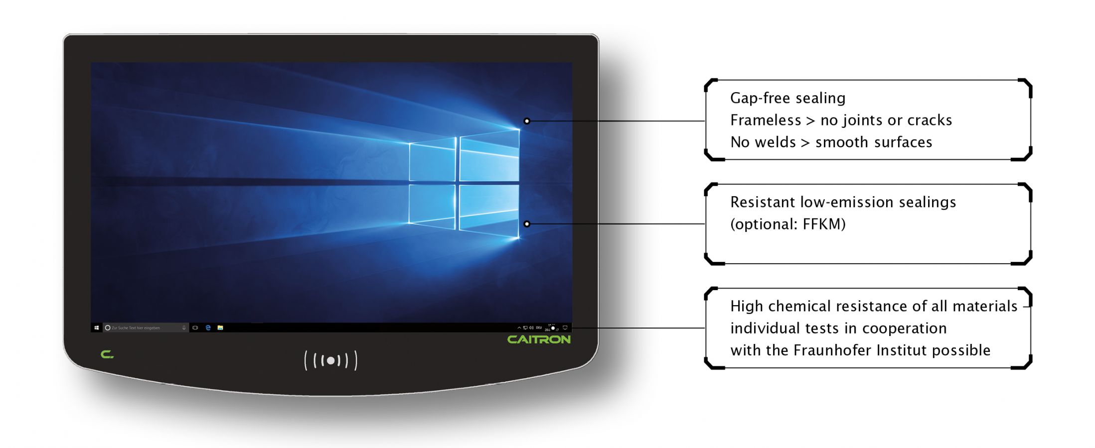 The industrial and cleanroom PCs from CAITRON can be equipped with integrated reader modules (Legic, Mifare, HiTAG). This enables seamless integration with cross-device integrated rights management and access control solutions. Employees contact the HMI contactlessly using RFID transponders. Thus, access permissions can be coupled with existing authentication solutions (e.g., access control, time tracking).