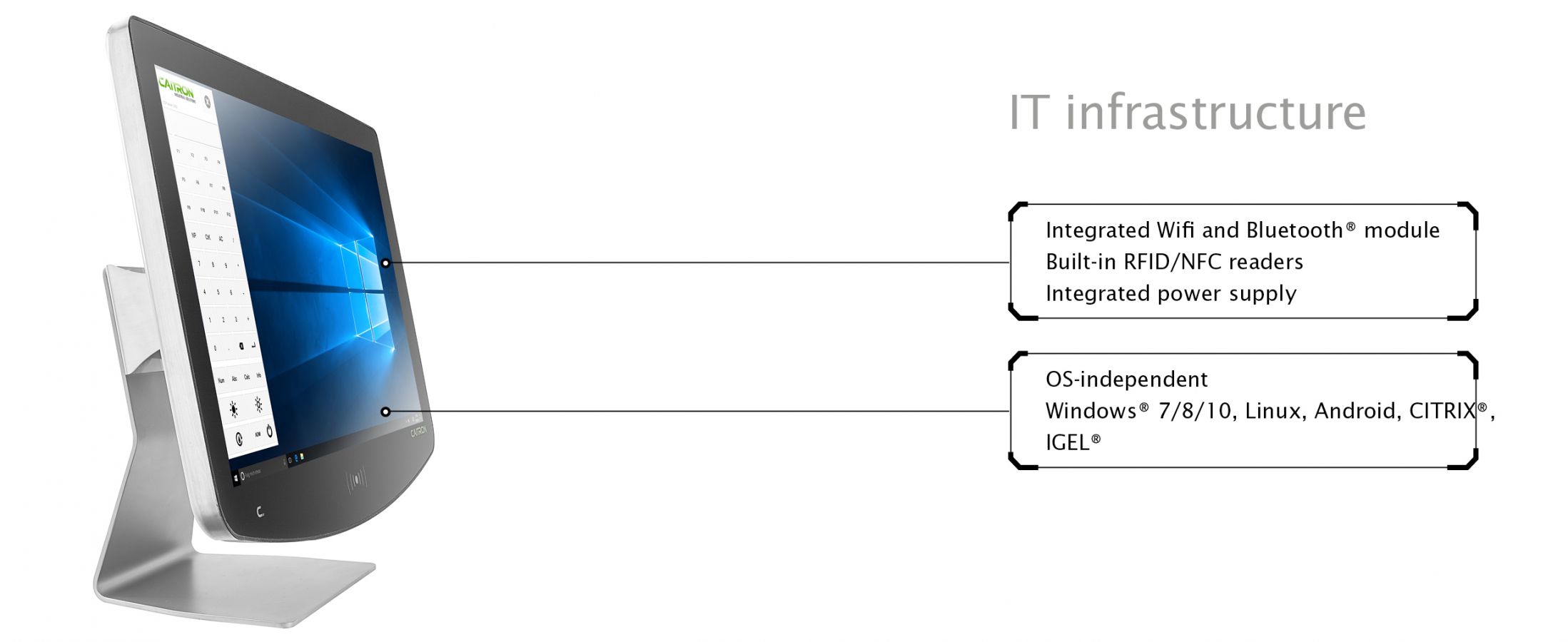 The industrial PCs from CAITRON can be equipped with integrated reader modules (Legic, Mifare, HiTAG). This enables seamless integration with cross-device integrated rights management and access control solutions. Employees contact the HMI contactlessly using RFID transponders. Thus, access permissions can be coupled with existing authentication solutions (e.g., access control, time tracking).